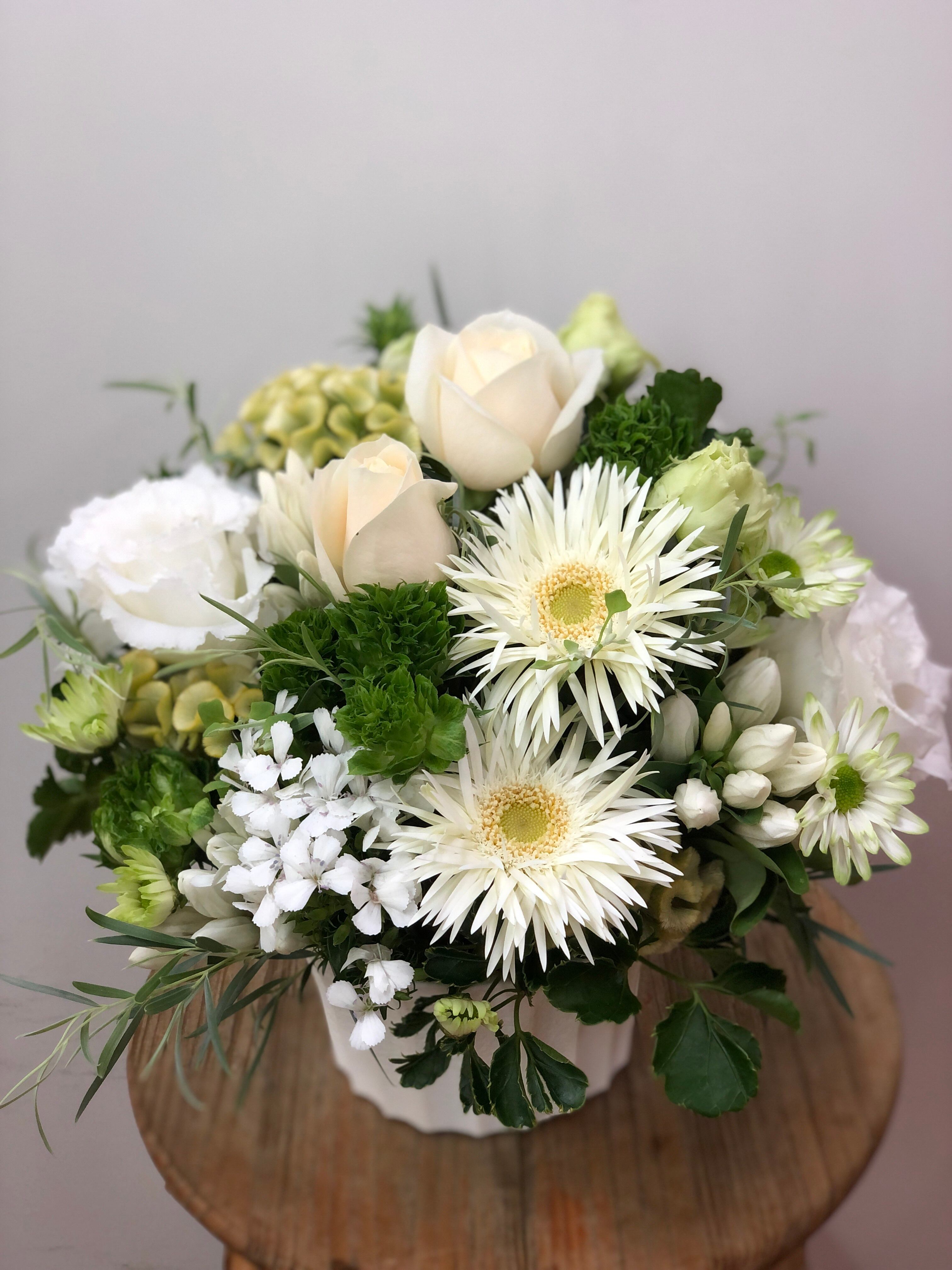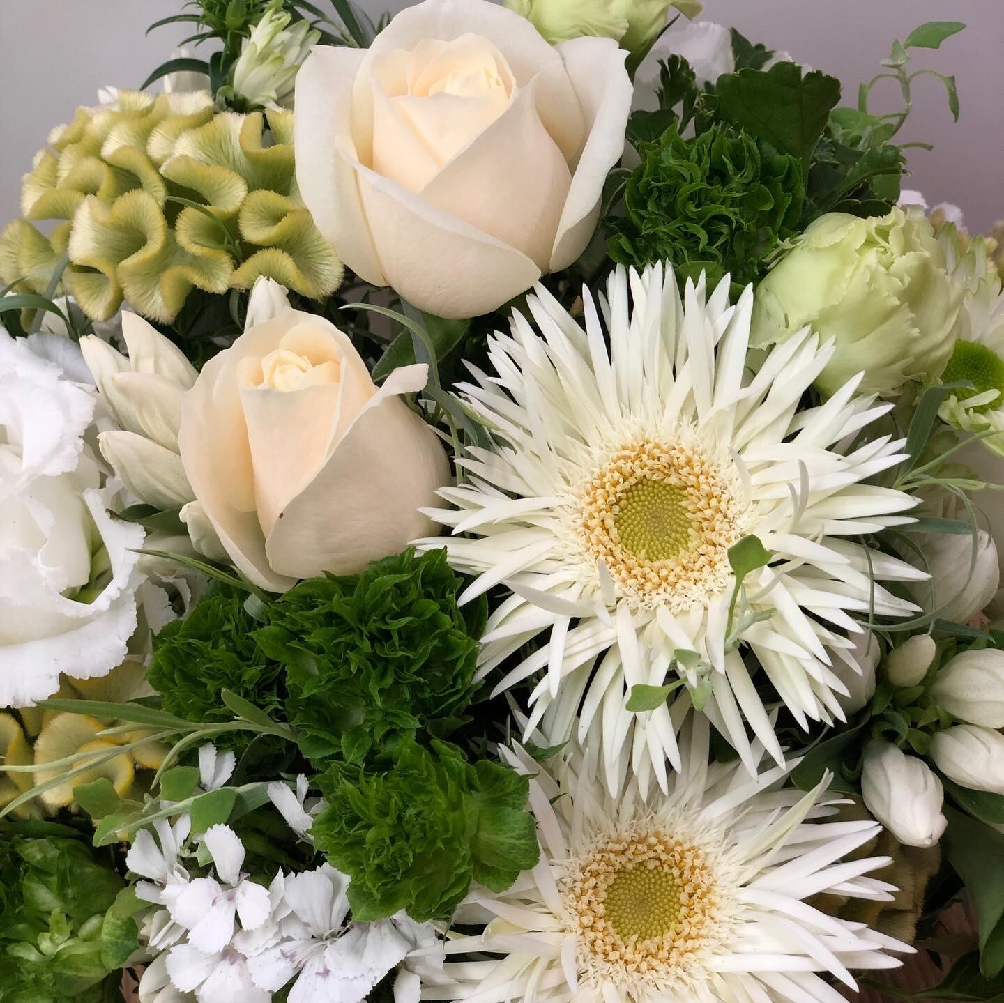 白ベースのアレンジメントですが、ご要望が有ればお色のお花をプラスする事も出来ます